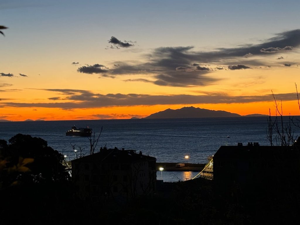 Catching a departing ferry at sunrise can be spectacular! (View from our Hotel Le Bastia room)