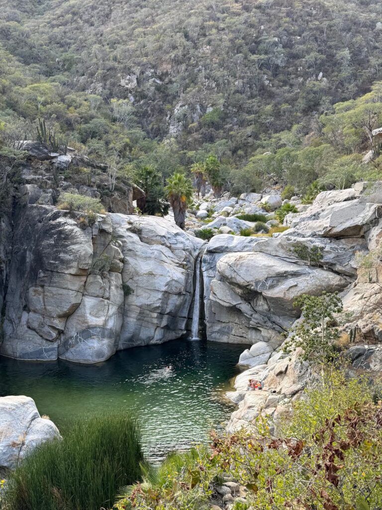 Our first stop was hiking into Cascada Sol de Mayo (Fox Canyon Waterfall) to a 40ft waterfalls, and swimming pond beneath the falls. The hike in over dry parched land, rocks, cactus and thorny bushes was rewarded with what initially appeared like an oasis – a waterfall and aqua blue pond, surrounded by palm trees.