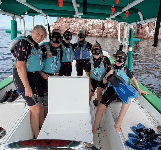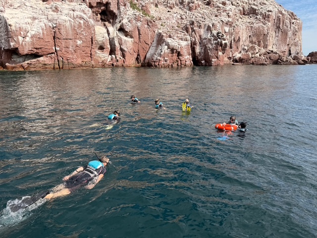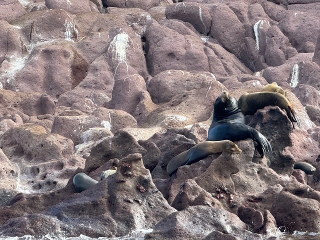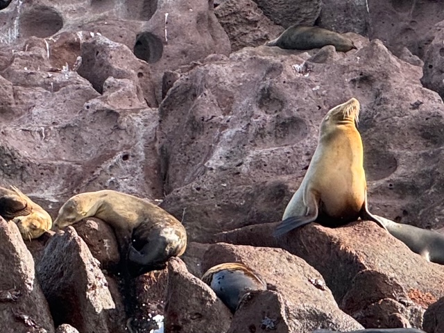 This would be our second day and overnight camping on La Parteda Island. After breakfast, we took the power boat out to a small island around the corner from our bay, called Los Eslotes. There we would witness sea lion pups and their mommas up close. After scouting the island shoreline from the boat, we anchored, which offered an opportunity to snorkel in the area. If was fascinating to observe the underwater sea life – fish, starfish and coral, plus the playful sea lions, gracefully moving from land to water swimming with joyful curiosity – us watching them, them watching us.
