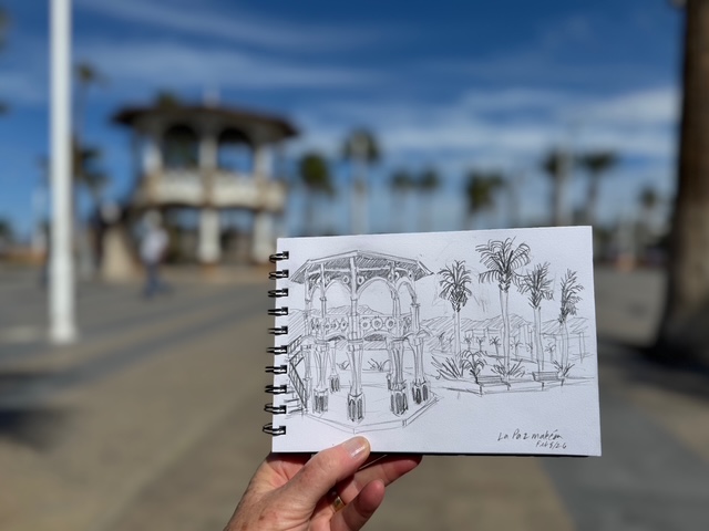 The La Paz Marceon Plaza is a city park and gathering area along the city waterfront. I chose it as a fitting end to my time in La Paz – a way to observe intently through sketching, while becoming fully aware of life around me. For an hour I enjoyed drawing the plaza, with palms in the background, the boardwalk, buildings and restaurants reseeding into the hills at a distance.