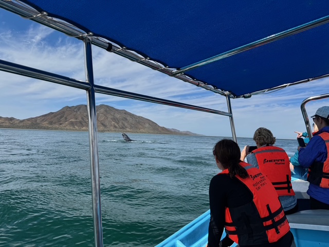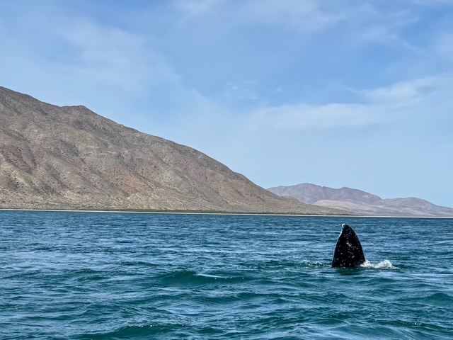We learned that single males leave first in March/April to migrate north, while those pregnant, or Moms with a baby whale, stay in the Baja longer, until April/May – when the baby whale is strong enough to swim north.