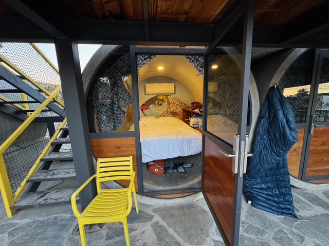 Pods are air conditioned, but have limited space. Think bed, shelves and not much more. But honestly, what more do you need? There is a shower room, and a toilet/sink room for both men and women which is shared. The facilities are stylish and kept immaculately clean. There is also a rooftop deck, and an open deck area with a gas fire pit, which was lovely for both sunrise and sunset.
