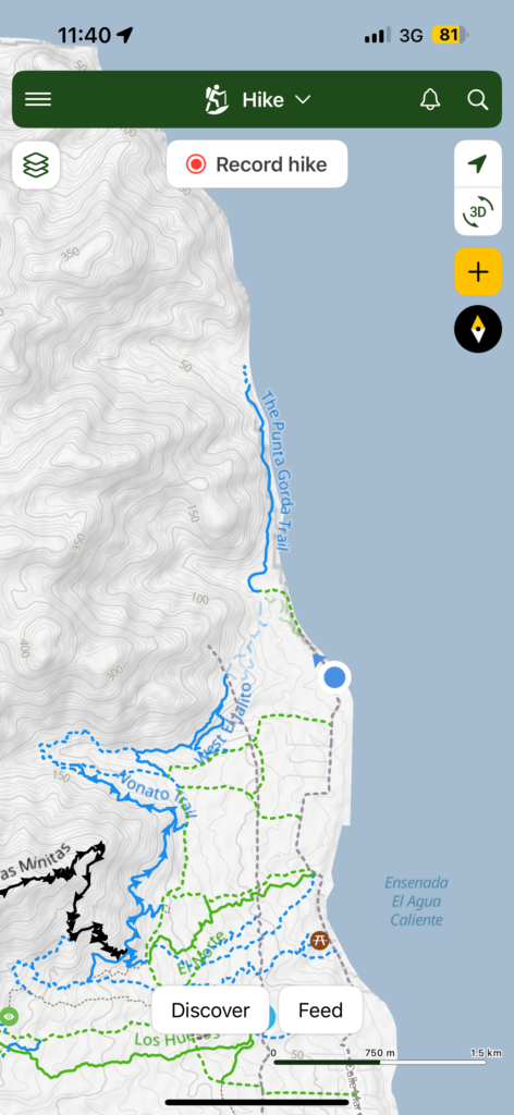 The Punta Gorda Trail is a beautiful hike. I did it between 11:30-1:30/2pm at the heat of the day, but there was a nice breeze off the water. Be sure to take water, and a towel since you are able to swim at the end down by a beach. Use the Trailforks app to track yourself on the trail and stay on course.
