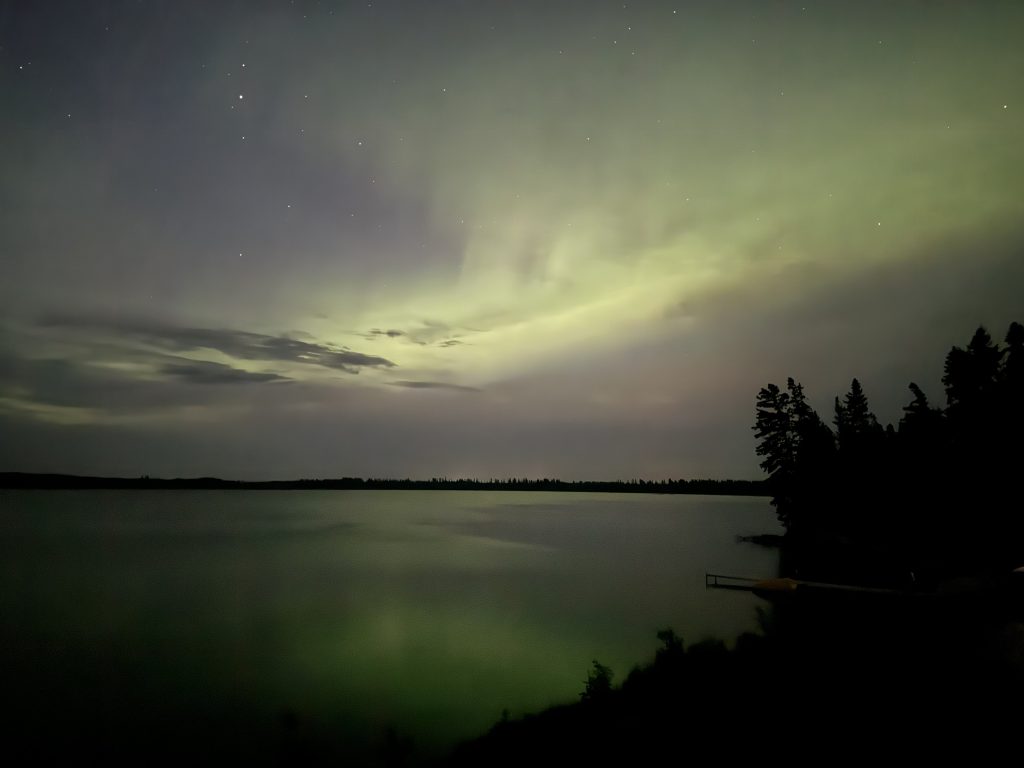 Northern lights over Greig Lake, illuminating the shore and a canoe briefly